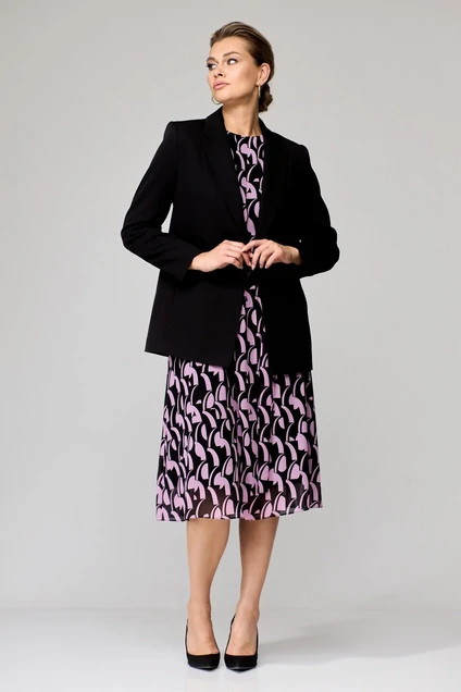 Костюм состоит из жакета и платья. Жакет полуприлегающего силуэта с однобортной застежкой на одну пуговицу и воротником пиджачного типа. Перед и спинка с рельефами из проймы. По спинке средний шов. Рукав втачной двухшовный. Жакет на подкладке. Платье А- образного силуэта на подкладке. Перед с нагрудными вытачками. Спинка со средним швом сверху с разрезом и застежкой на петлю и пуговицу. Рукав втачной одношовный со сборкой по окату и по шву притачивания манжеты. Низ рукава обработан манжетой, которая застегивается на петлю и пуговицу. К платью прилагается пояс из основной ткани. Длина платья - 111 см., рукава-44 см. Длина жакета - 72 см, длина рукава - 60 см.