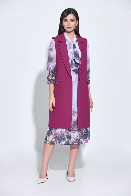 Костюм состоит из жилета и платья. Платье А- образного силуэта на подкладке. На полочке две нагрудные вытачки, в верху обработан разрезик в виде капли. Красивый воротник стойка переходящий в бант. Спинка со средним швом расширенная к низу. Рукав одношовный, четвертной. Низ рукава обработан манжетой, которая застегивается на петлю и пуговицу. К платью прилагается ремень из экокожи с металлической пряжкой. Жилет прямого силуэта на подкладке с центральной застежкой на одну прорезную петлю и пуговицу. Спинка со средним швом заканчивается шлицей. Воротник пиджачного типа. Перед с настрочными клапанами в области талии. Длина платья 115 см, рукава 47 см.платье: хлопок 97% эластан 3%
