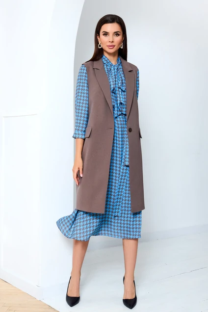 Костюм состоит из жилета и платья. Платье А- образного силуэта на подкладке. На полочке две нагрудные вытачки, в верху обработан разрезик в виде капли. Красивый воротник стойка переходящий в бант. Спинка со средним швом расширенная к низу. Рукав одношовный, четвертной. Низ рукава обработан манжетой, которая застегивается на петлю и пуговицу. К платью прилагается пояс из основной ткани. Жилет прямого силуэта на подкладке с центральной застежкой на одну прорезную петлю и пуговицу. Спинка со средним швом заканчивается шлицей. Воротник пиджачного типа. Перед с настрочными клапанами в области талии. Длина платья 115 см, рукава 47 см