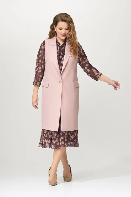 Костюм состоит из жилета и платья. Платье А- образного силуэта на подкладке. Перед с нагрудной вытачкой, в верху обработан разрезик в виде капли. Воротник стойка переходящий в бант. Спинка со средним швом. Рукав одношовный, четвертной. Низ рукава обработан манжетой, которая застегивается на петлю и пуговицу. К платью прилагается пояс из основной ткани. Жилет прямого силуэта на подкладке с центральной застежкой на одну петлю и пуговицу. Спинка со средним швом заканчивается шлицей. Воротник пиджачного типа. Перед с настрочными клапанами в области талии. Длина жилета - 96 см. Длина платья 115 см, рукава 47 см.