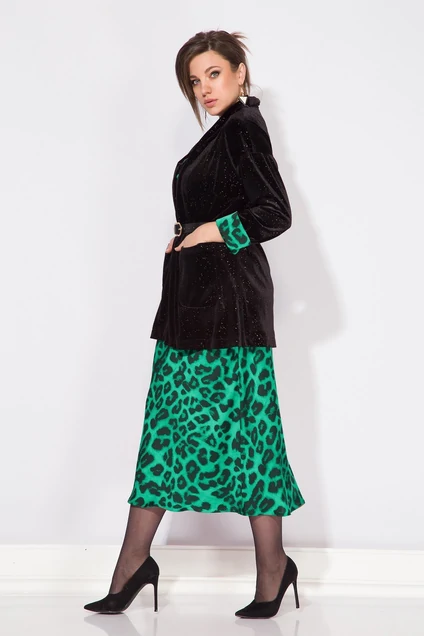 Стильный, нарядный комплект, состоящий из платья-комбинации и свободного жакета. Платье комбинация, выполнено из ткани под шелк в яркий леопардовый принт. Модель полуприталенного силуэта, на бретелях с регулировкой. Лиф изделия выполнен как цельнокроеная качель, что выгодно подчеркивает достоинства вашей фигуры. В комплект входит облегченный жакет, выполненный из королевского бархата с мерцающим эффектом. Модель со спущенной линией плеча, с длинным рукавом с под воротом на манжеты. Воротник в виде шали с подбортом. По полочке расположены накладные карманы. В боковых участках предусмотрены разрезы. Длина платья – 125-130 см.
