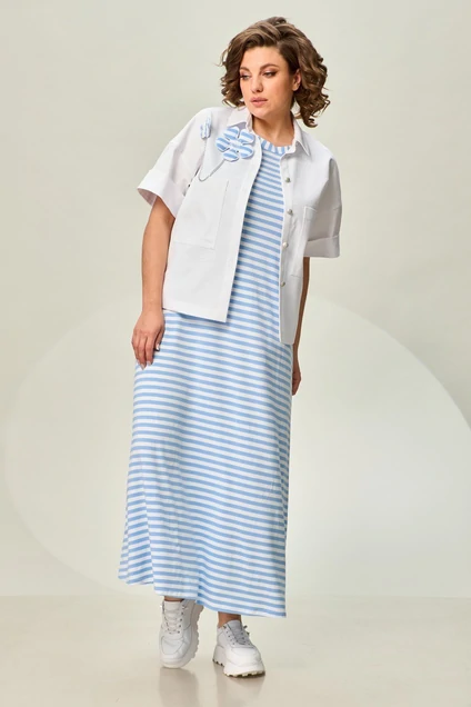Блуза свободного силуэта со спущенным рукавом на манжете, изготовленная из тонкого джинсового полотна. Воротник рубашечного типа. По переду накладные карманы, застежка на петли и пуговицы, по спинке кокетка, в боковых швах разрезы. В качестве декора в комплекте съемная брошь в цвет платья.