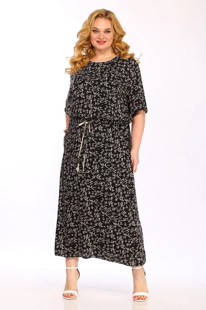 Комплект женский свободного силуэта, состоит из блузы и нижнего платья. Блуза имеет горловину круглой формы, обработанную кантом. Рукав спущенный, длиной до локтя. Низ блузы на кулисе с завязками. Платье состоит из двух видов ткани. Платье без рукавов с углубленной проймой. Нижняя часть платья по спинке слегка присборена. В боковых швах имеются карманы.