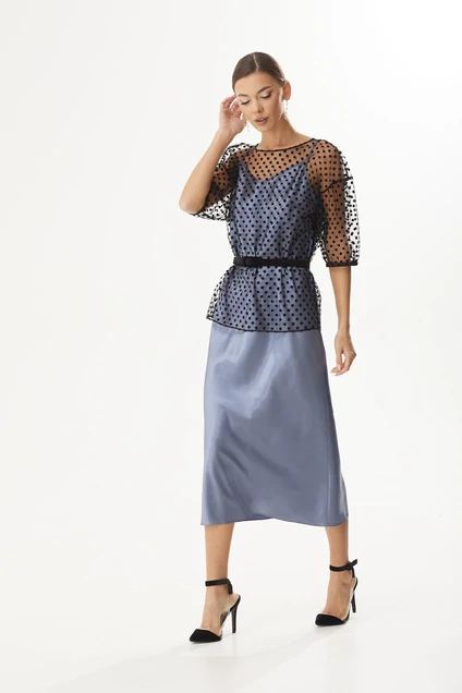Платье- комбинация полуприлегающего силуэта, на регулируемых бретелях, с нагрудными вытачками. Блуза прямого силуэта. Перед цельнокроеный. Спинка цельнокроеная, в области горловины обработана застежка-капелька на пуговицу и навесную петлю. Горловина округлой формы. Плечо спущено.Рукав одношовный, по низу обработан узкой притачной манжетой, застегивающейся на петлю и пуговицу.