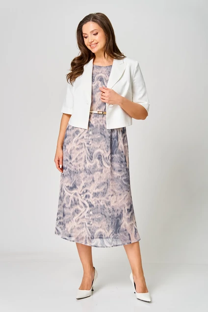 Платье выполнено из шифона, на трикотажной подкладке. Силуэт прямой, чуть расширен к низу. Покрой цельновыкроенный. Рукав короткий. Низ рукава оформлен манжеткой. По переду нагрудные выточки. Горловина овальная. Платье без застёжки. Спинка со средним швом без особенностей. Съёмный тонкий ремешок в комплекте.