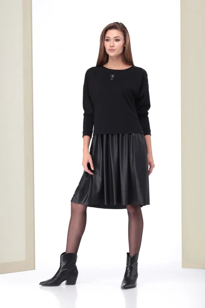 Комплект женский состоит из платья и туники. Платье на бретелях, верхняя часть трикотаж, нижняя часть выполнена из ткани с напылением под кожу. Туника из трикотажного полотна с круглым вырезом горловины. Линия плеча спущена, рукав длинный зауженный к низу. Спинка удлиненная, по боковым швам разрезы. По левому плечу декоративная застежка с кнопками.