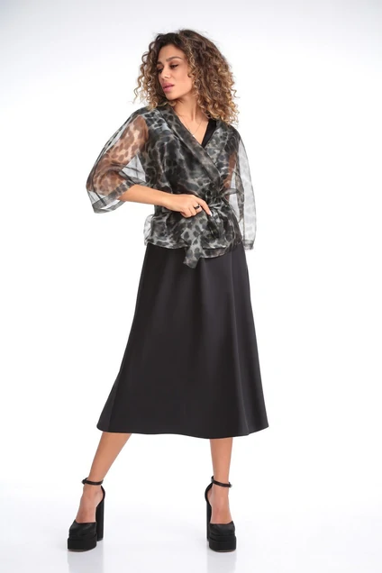 Комплект состоит из блузки и платья. Блузка на запах, органза с принтом леопард. Платье из сатина, лиф отрезной , плечико немного спущено, низ платья скроен по косой расширение "полусолнце". Длина платья 113 см.