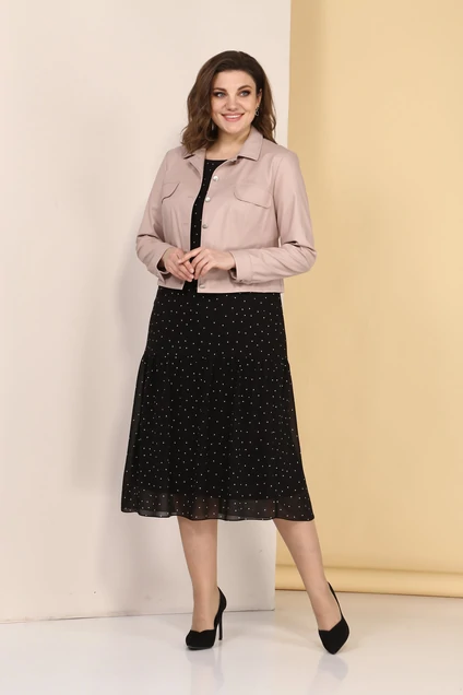 Комплект женский состоит из платья и жакета-куртки. Платье на подкладке А-образного силуэта с цельнокроенным рукавом и воланом по низу. Жакет без подкладки прямого силуэта, декорирован кокеткой по линии груди, карманы отсутствуют. Воротник стояче-отложной, застежка центральная на молнию. Рукав втачной двухшовный с манжетой, застегивающейся на петлю и пуговицу.платье : полиэстер 93% вискоза 7%