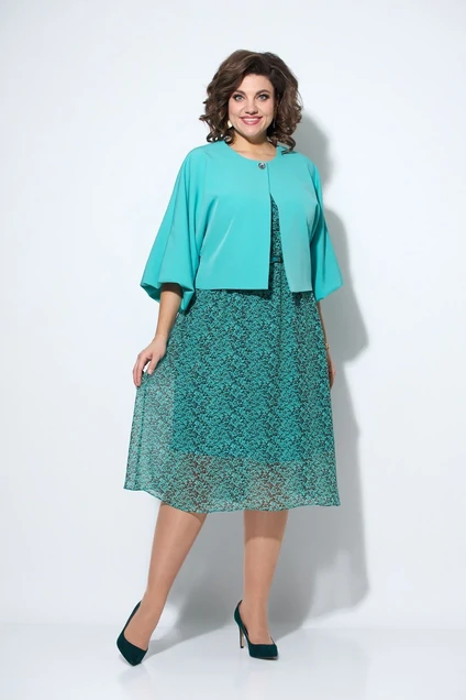 Нарядный женский комплект, состоящий из укороченного жакета на подкладке и шифонового платья на подкладке. Жакет с застежкой на кнопку, вырез горловины круглый, рукав длиной ¾, пышный по низу. Платье свободного силуэта, расширенное к низу, длиной ниже колена, с коротким рукавом. В качестве декора прилагается тонкий ремень.