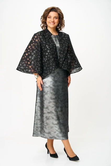 Нарядный женский комплект, состоящий из платья и блузона. Платье приталенное, удлиненное, без рукавов, с застежкой на потайную молнию по спинке. Блузон из прозрачной ткани с добавлением метонити, свободного облегания, силуэт расширенный к низу, без застежки, с воротником стойкой и отварачивающимся лацканами, рукав 7/8 расширенный к низу.