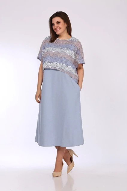 Комплект 2-х предметный, состоящий из блузы и платья. Блуза прямого силуэта, с круглым вырезом горловины и спущенными плечевыми швами. Низ блузы фигурный. Спинка длиннее переда, отлетная с запахом. Платье удлиненное, А-силуэта, с полукруглым вырезом горловины. Перед с нагрудными вытачками. Спинка со средним швом и талиевыми вытачками. В боковых швах платья обработаны карманы. Рукава втачные, одношовные, короткие. Размеры 54-58: Длина блузы 57 см, длина рукава блузы 22 см, длина платья 113 см.