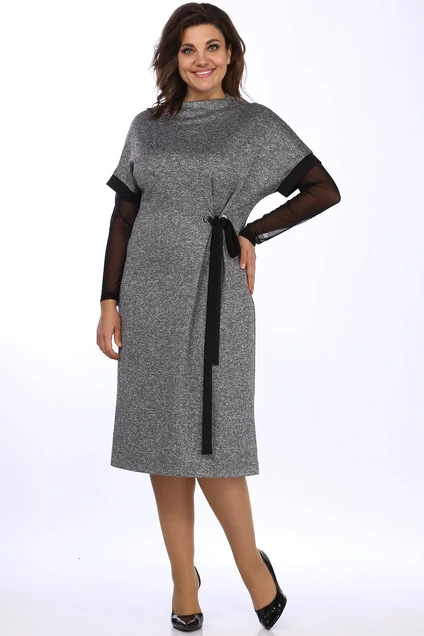 Комплект 2-ух предметный, состоит из гольфа и платья. Гольф с круглым вырезом горловины. Рукава втачные, одношовные. Платье с цельнокроеными, короткими рукавами, обработанные притачными манжетами. Перед асимметричный. Спинка с потайной тесьмой - "молнией" в среднем шве. Размеры 48-52: длина платья 108 см, длина рукава 25 см. Размеры 54-58: длина платья 111 см, длина рукава 27 см.