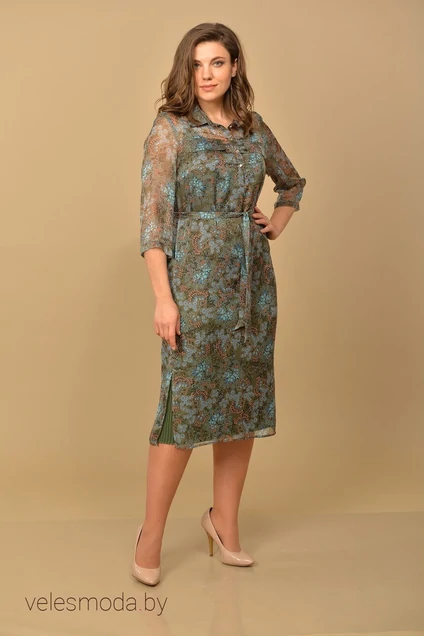 Платье прямого силуэта, с круглым вырезом горловины, обработанного стояче-отложным воротником с отрезной стойкой. Перед с нагрудными вытачками, застежкой-планкой на петли и пуговицы. Рукава втачные, одношовные. Туника прямого силуэта, на бретелях. Перед с нагрудными вытачками. По низу юбка с отделочной ткани.