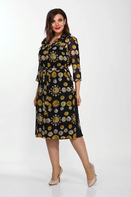Комплект 2-ух предметный, состоит из туники и платья. Платье прямого силуэта, с круглым вырезом горловины, обработанного стояче-отложным воротником с отрезной стойкой. Перед с нагрудными вытачками, застежкой-планкой на петли и пуговицы. Рукава втачные, одношовные. Туника прямого силуэта, на бретелях. Перед с нагрудными вытачками. По низу юбка с отделочной ткани. Платье комплектуется съемным поясом. Размеры 48-52: длина верхнего платья 113 см, длина рукава 60 см, длина туники 95 см. Размеры 54-58: длина верхнего платья 115 см, длина рукава 60 см, длина туники 95 см