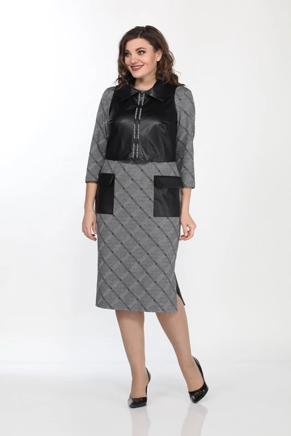 Комплект 2-ух предметный, состоит из жилета и платья. Жилет прямого силуэта,из кожи, с круглым вырезом горловины, обработанного воротником. Перед с нагрудными вытачками, центральной застежкой на тесьму - "молнию". Платье прямого силуэта, с круглым вырезом горловины. Перед с нагрудными вытачками, нагрудными карманами из кожи с клапанами, отделочной деталью по низу. Спинка со средним швом, отделочной деталью по низу, обработанной разрезами в боковых швах. Рукава втачные, одношовные, длиной 3/4. Размеры 48-52: длина платья 108 см, длина рукава 46 см, длина жилета 45 см