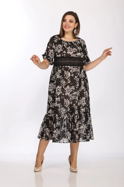 Комплект женский, 2-ух предметный, состоящий из платья и нижнего платья. Платье женское, А - силуэта, из шифона. С круглым вырезом горловины, обработанным окантовкой , из-под которой сборка. Между лифом и юбкой платья широкое кружево. Лиф спинки со средним швом, в ерхней части которого обработан разрез, застегивающийся на навесную петлю и пуговицу. Короткие рукава реглан, низ которых обработан двойными рюшами. Юбка платья с воланом понизу. Нижнее платье прямого силуэта, на бретелях. Размеры 48-52: длина платья 117 см, длина рукава 22 см.