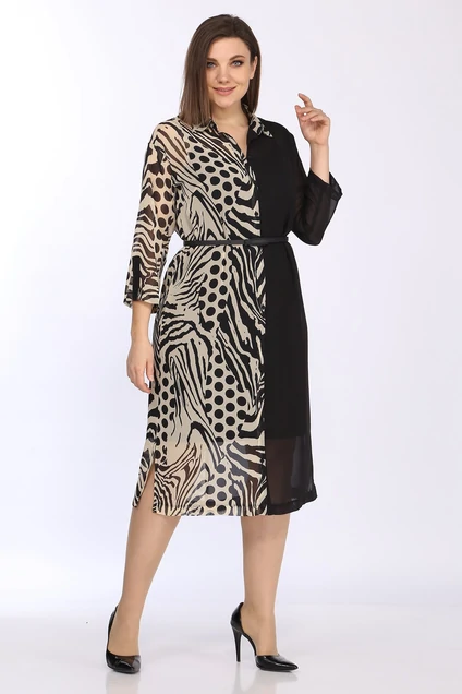 Комплект женский, состоящий из платья и туники. Платье женское, прямого силуэта, из шифона, длинное. С круглым вырезом горловины, обработанным воротником с отрезной стойкой. Детали переда с нагрудными вытачками. Центральная застежка на петли и пуговицы. По краю борта на расстоянии 2 см проложена отделочная строчка, имитирующая планку. Боковые швы заканчиваются разрезами. Спинка со средним швом. Со спущееной линией плеча, рубашечными рукавами, длиной 3/4. Низ рукавов с отделочным хлястиком, на котором пришиты 3 пуговицы. Платья комплектуется съемным поясом. Нижнее платья из трикотина. На бретелях. Размеры 48-52: длина платья 118 см, длина рукава 43 см.