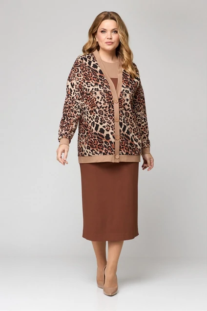 Комплект женский (кардиган и платье). Кардиган женский из трикотажного полотна, прямого силуэта, длиной ниже линии бедер, со спущенной линией плеча, с втачными рукавами, с застежкой на 4 петли и 4 пуговицы. Детали переда кардигана с притачными планками, переходящие по горловине спинки. Рукава втачные одношовные, с притачными манжетами. Платье женское из трикотажного полотна, повседневное, прилегающего силуэта, длиной до середины икр, с втачными рукавами, с застежкой на потайную тесьму-молнию в среднем шве спинки. Деталь переда платья с кокеткой, с нагрудными вытачками. Деталь спинки платья с кокеткой, со средним швом, который заканчивается шлицей, нижняя часть с талиевыми вытачками. Рукава втачные одношовные. Вырез горловины платья округлой формы «под горло». Кардиган: длина спинки – 73см. Платье: длина спинки – 122см. Кардиган: длина рукава - 46см, ширина рукава – 24см. Платье: длина рукава – 58см, ширина рукава – 19см. Платье: вискоза – 60%, нейлон – 35%, спандекс – 5%.