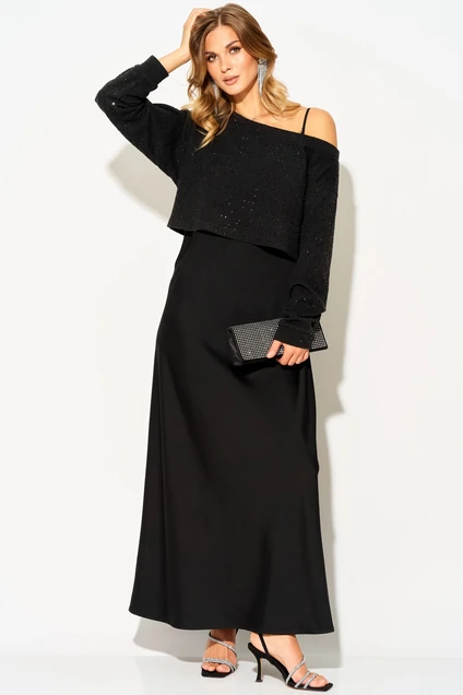 Платье полуприлегающего силуэта, длиной «в пол», на бретелях, с «V-образным» вырезом горловины спинки и переда. Деталь переда платья с нагрудными вытачками, горловина оформлена декоративным кружевом.
