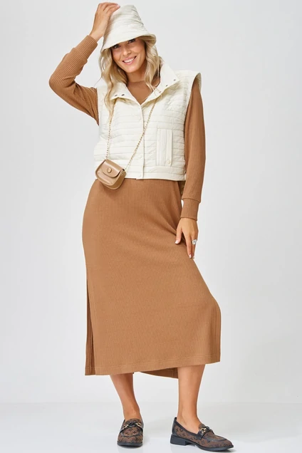 Платье женское из трикотажного полотна, повседневное, полуприлегающего силуэта, длиной до середины икр, с втачными рукавами, по горловине – втачная бейка. В боковых швах обработаны разрезы. Деталь переда платья с нагрудными вытачками. Рукава втачные одношовные, с притачными манжетами.