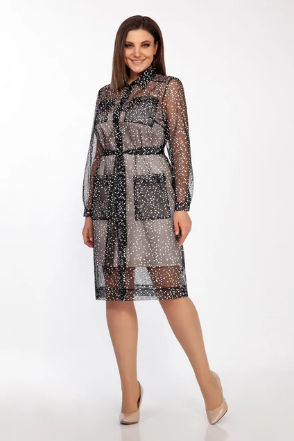 Верхняя часть платья (прозрачная) – прямого силуэта, на сквозной застежке-планке на пуговички. Воротник на стойке.