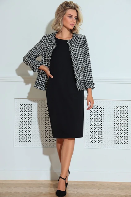 Комплект женский состоящий из жакета и платья. Жакет полуприлегающего силуэта на подкладке. Рукав втачной укороченный. Вырез горловины круглый, застежка центральная встык застегивающаяся на потайные крючки. По переду накладные карманы с декоративными пуговицами. Отделка бахромой по горловине, борту, рукавам, карманам, низу изделия. Платье полуприлегающего силуэта на подкладке , без рукава со спущенной линией плеча. Вырез горловины округлый. Застежка на потайную тесьму-молнию в среднем шве спинки и разрезом. Платье: 100% ПЭ