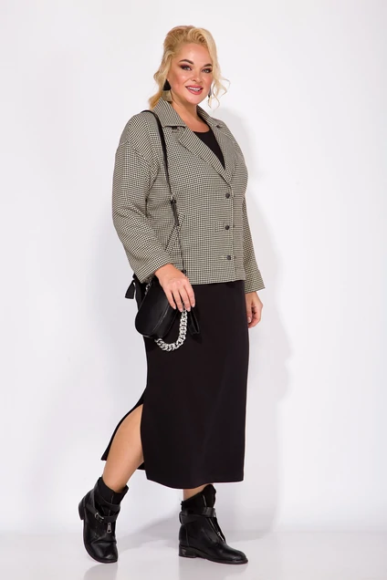 Эффектный комплект в стиле Casual, состоящий из удлиненного трикотажного платья и жакета из гусиной лапки. Жакет свободного силуэта, без подкладки, выполнена из текстильной ткани. Модель с отложным воротником, с центральной застежкой на кнопки. По полочке расположены прорезные карманы с листочкой. Рукав вточной, на спущенном плечевом поясе, на притачной манжете. Спинка прямая. По боковым швам расположены небольшие разрезы с завязкой. Платье в комплекте прямого силуэта, с боковыми разрезами по низу. Горловины округлой формы; по лифу печать. Рукав вточной, длиной ¾-ти.Хит продаж – 2022-23! Длина куртки – 60 см, рукав –58+манжет 6 см. ; платье 120, рукав – 45 см.