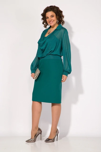 Эффектный, элегантный комплект состоящий из лаконичного платья футляра и свободной блузки из креп-шифона. Платье приталенного силуэта, отрезной по талии. Лиф с эффектом корсета и регулируемыми бретельками по спинке. Застежка – потайная тесьма-молния в боковом шве. Сзади обработан разрез. В комплекте свободная блузка из креп-шифона с мерцающим эффектом. Модель с отложным воротником и качелью по переду. По низу предусмотрен пояс с резинкой-венгеркой по спинке. Рукав вточной рубашечный, по низу обработан манжет с прорешкой на пуговку. Спинка с декоративным разрезом по центру, украшен бусинами. Такой лаконичный и эффектный комплект можно носить Длина платья – 106 см.