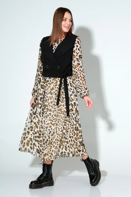 Шифоновое платье свободного силуэта на трикотажной подкладке. Горловина овальной формы. Платье отрезное чуть выше линии талии, на сборке. Рукав втачной. Низ рукава собран на эластичную тесьму. Жилет с нагрудными вытачками, отложными лацканами и двубортной застёжкой на петли и пуговицы. Спинка жилета с отлетной деталью. По низу жилета располагаются шлёвки с продетым в них съёмным поясом. Жилет на подкладке.