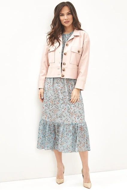 Элегантный комплект из летящего шифонового платья и стильной куртки, выполненной из эко кожи. Платье полуприлегающего силуэта с отрезной талией, присборенной на эластичную тесьму. Рукав втачной с пришивной манжетой, с застежкой на пуговицу. По низу платья пришивной валан. Платье на подкладке, выполненной из нежного сатина. Куртка прямого кроя, на подкладке, с центральной застежкой на пришивные пуговицы. Дополнена нагрудными накладными карманами с клапанами. Рукав спущен. Дополнен пришивной манжетой с застежкой на пуговицы.Длина платья от плечевого шва 118см. Длина рукава 45см. Длина куртки от плечевого шва 53см. Длина рукава 56см.