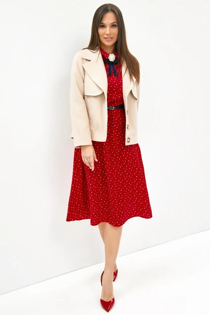 Элегантный комплект из струящегося платья и стильной куртки, выполненной из пальтовой ткани. Куртка прямого кроя, на подкладке, с центральной застежкой на пришивные пуговицы. Дополнена функциональными карманами в боковых швах. Рукав спущен. Платье полуприлегающего силуэта с отрезной талией. Застежка на потайную моллнию по спинке платья.Рукав спущен. Основание рукава с пришивной манжетой, с застежкой на пуговицы. Платье дополнено съемной брошью ручной работы и поясом, выполненным из эко кожи. Длина платья от плечевого шва 117 см. Длина рукава 61 см. Длина куртки от плечевого шва 61 см. Длина рукава 61 см
