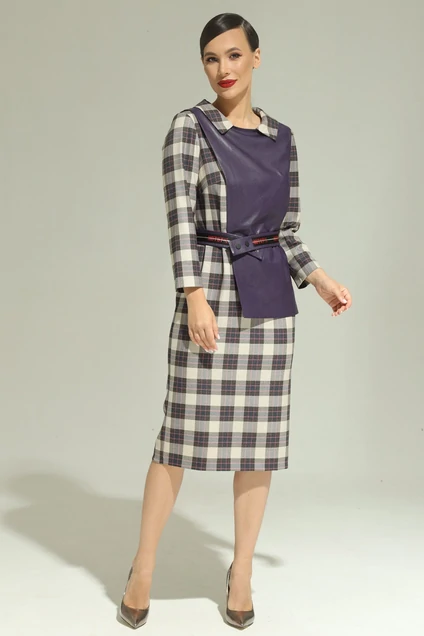 Стильный комплект из платья и оригинального жилетка. Платье прямого кроя с нагрудными вытачками. Выполнено из мягкой теплой космтюмно-плательной ткани. Рукав втачной. По спинке застежка на потайную молнию. Для удобства ходьбы дополнено разрезом сзади. Горловина платья обработана отложным воротником. Жилет выполнен из мягкой эко кожи на подкладке. Надевается через голову. Комплект притален за счет съемного пояса, выполненного из эко-кожи в тон жилета, с застежкой на металлические кнопки. Платье прекрасно смотрится как в комплекте с жилетом , так и отдельно. Длина платья от плечевого шва 109см. Длина рукава 52см. Длина жилета от плечевого шва 63см.