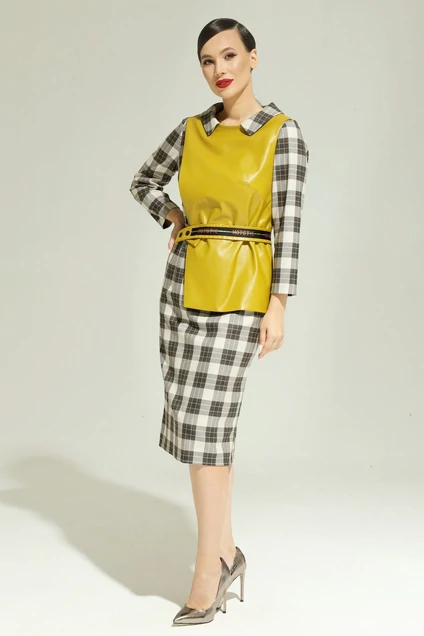 Стильный комплект из платья и оригинального жилетка. Платье прямого кроя с нагрудными вытачками. Выполнено из мягкой теплой космтюмно-плательной ткани. Рукав втачной. По спинке застежка на потайную молнию. Для удобства ходьбы дополнено разрезом сзади. Горловина платья обработана отложным воротником. Жилет выполнен из мягкой эко кожи на подкладке. Надевается через голову. Комплект притален за счет съемного пояса, выполненного из эко-кожи в тон жилета, с застежкой на металлические кнопки. Платье прекрасно смотрится как в комплекте с жилетом , так и отдельно. Длина платья от плечевого шва 109см. Длина рукава 52см. Длина жилета от плечевого шва 63см.