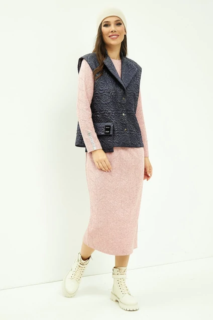 Стильный комплект, состоящий из трикотажного платья и утепленного жилета. Платье прямого кроя, длина миди. Рукав втачной. Платье без подкладки. Жилет прямого кроя с центральной зстежкой на металлические кнопки. Дополнен съемным поясом. Длина платья от плечевого шва 122см. Длина рукава 61см. Длина жилета от плечевого шва 63 см.