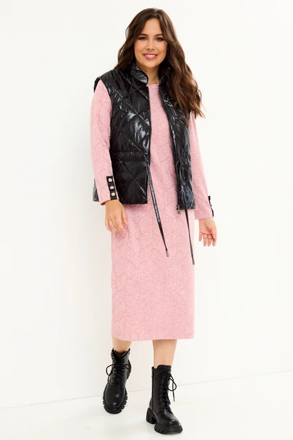 Стильный комплект из утепленного жилета и трикотажного платья. Платье-миди свободного прямого кроя, рукав втачной. Выполнено из плотного трикотажного полотна Вырез горловины округлой формы. Жилет прямого кроя с центральной застежкой на металлическую молнию. Жилет утеплен синтепоном. Можно приталить за счет кулиски с тесьмой, выполненной из основной ткани. Дополнен функциональными карманами. Длина платья от плечевого шва 111см. длина рукава 59см. Длина жилета от плечевого шва 58см.