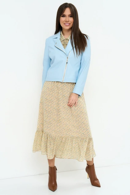 Стильный комплект из куртки и платья. Куртка-косуха выполнена из эко кожи, на подкладке. Платье на подкладке, полуприталенного силуэта с отрезной талией, с расширяющейся книзу юбкой. Низ юбки дополнен притачным валаном. Рукав втачной, присборенный к низу на эластичную тесьму. Платье дополнено съемным поясом в цвет платья. Длина платья от плечевого шва 134см. Длина рукава 46см. Длина куртки от плечевого шва 54см. Длина рукава 59см.