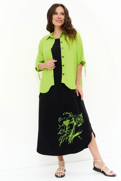 Легкий стильный комплект из платья и блузы, выполненных из комфортного поливискозного полотна. Платье свободного кроя, без рукавов и застежки. Дополнено накладным карманом с красивой декоративной пуговицей. Спереди по низу нанесена термоаппликация в цвет блузы. Блуза рубашечного кроя с центральной застежкой на пришивные пуговицы. Рукав длиной ниже локтя, слегка спущен. Дополнен кулиской с тесьмой, выполненной из основной ткани. По спинке блуза дополнена термоаппликацией в цвет платья. Длина платья от плечевого шва 130см. Длина блузы от плечевого шва 70см. Длина рукава 35см.