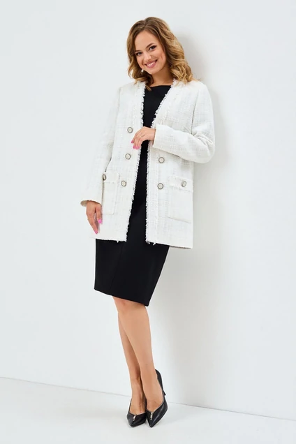 Элегантный комплект из удлиненного жакета и платья. Жакет прямого кроя, на подкладке. Дополнен накладными боковыми карманами. Рукав втачной. Застегивается жакет на потайные крючки. Классическое платье полуприлегающего силуэта с застежкой по спинке на потайную молнию. Длина жакета от плечевого шва 78 см. Длина рукава 60 см. Длина платья от плечевого шва 107 см. Длина рукава платья 27 см.