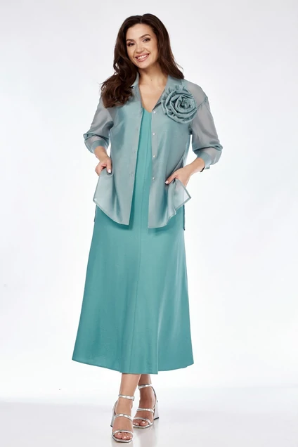 Элегантный комплект из блузы и платья. Блуза свободного рубашечного кроя с центральной застежкой на пришивные пуговицы. Выполнена из полупрозрачной и очень нежной поливискозы с легким жемчужным блеском. Воротник отложной. Рукав втачной, слегка спущен, дополнен притачной манжетой с застежкой на пришивную пуговицу. Блуза дополнена съемной брошью ручной работы в виде цветка, выполненного из основной ткани. Платье А-образного силуэта без рукава. Выполнено из приятной к телу поливискозной ткани. По спинке застежка на потайную молнию. Длина блузы от плечевого шва 66см. Длина рукава 60см. Длина платья от плечевого шва 130см.