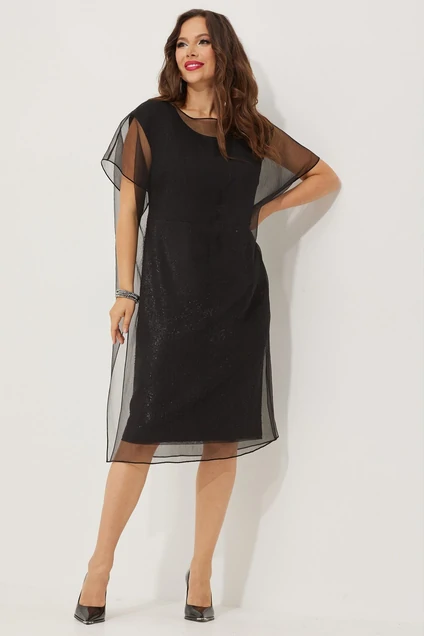 Нарядный комплект из платья и блузы-накидки. Платье полуприталенного силуэта с отрезной талией, на подкладке. Верх платья выполнен из плательной ткани, низ- из ткани в черные, слегка мерцающие пайетки. Застежка по спинке на потайную молнию. По низу спинки расположен разрез. Блуза -накидка выполнена из воздушной невесомой органзы с двумя боковыми разрезами. Украшение в комплект не входит. Длина платья от плечевого шва 106 см.