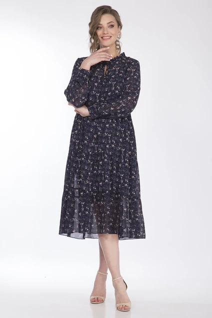 Комплект женский 2-х предметный, состоящий из верхнего платья и комбинации. Верхнее платье из шифона, вырез горловины круглый, воротник стойка с рюшей на завязках. Перед и спинка платья с 3-я воланами, которые присборены. Рукав втачной, длинный, на манжете. В комплект входит комбинация из трикотажной подкладки. Верхнее платье длина по спинке 115см, длина рукава с манжетом 63см, ширина рукава на уровне глубины проймы 5-18см,52-18,5см, 54-19,5см, 56-20,5см. Реальные замеры изделия 50 ог-106см, от-110см, об по второму волану 138см, 52 ог-110см, от-114см, об по второму волану 142см, 54 ог-114см, от-118см, об-по второму волану 146см, 56 ог-118см, от-122см, об по второму волану 150см. Нижнее платье длина спинки 81см. Реальные замеры платья 50 ог-98см, об-104см, 52 ог-102см, об-108см, 54 ог-106см, об-112см, 56 ог-110см, об-116.