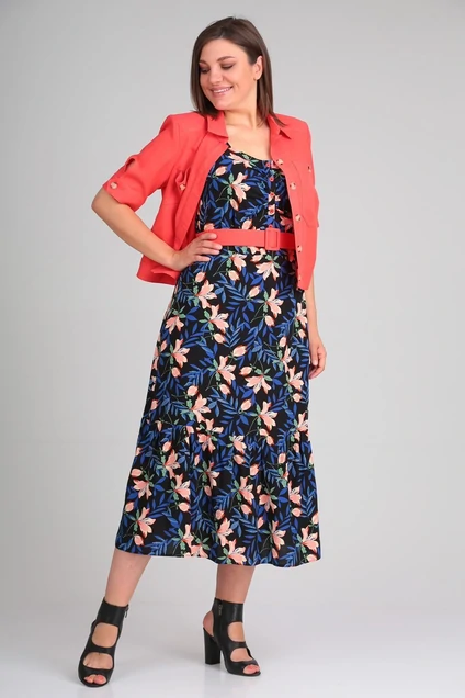 Комплект женский, состоящий из сарафана и жакета. Сарафан полуприлегающего силуэта, на широких бретелях. Вырез горловины-фигурный. По талии-подрез. По низу сарафана-валан со сборкой. Декором служит-недействующая планка с пуговицами. Жакет укороченный, свободного силуэта. Воротник рубашечного типа. Рукав втачной, на манжете-застёгивающийся на пуговицу. По переду-накладные карманы и застёжка на петли-пуговицы.