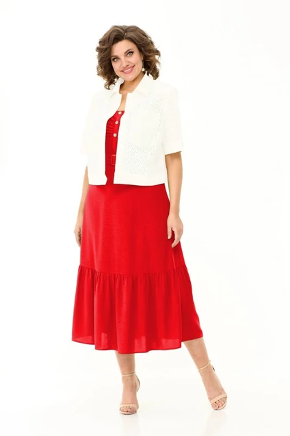 Комплект женский, состоящий из сарафана и жакета. Сарафан полуприлегающего силуэта, на широких бретелях. Вырез горловины-фигурный. По талии-подрез. По низу сарафана-валан со сборкой. Декором служит-недействующая планка с пуговицами. Жакет укороченный, свободного силуэта. Воротник рубашечного типа. Рукав втачной, на манжете-застёгивающийся на пуговицу. По переду-накладные карманы и застёжка на петли-пуговицы. Длина по спинке жакета-48см, длина рукава-30см. Длина по спинке сарафана-121см. Состав сарафана: вискоза-60%, полиэстер-35%, спандекс-5%.