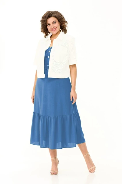 Комплект женский, состоящий из сарафана и жакета. Сарафан полуприлегающего силуэта, на широких бретелях. Вырез горловины-фигурный. По талии-подрез. По низу сарафана-валан со сборкой. Декором служит-недействующая планка с пуговицами. Жакет укороченный, свободного силуэта. Воротник рубашечного типа. Рукав втачной, на манжете-застёгивающийся на пуговицу. По переду-накладные карманы и застёжка на петли-пуговицы. Длина по спинке жакета-48см, длина рукава-30см. Длина по спинке сарафана-121см. Состав сарафана: вискоза-60%, полиэстер-35%, спандекс-5%.