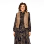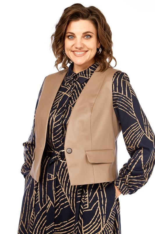 Комплект женский, состоящий из платья и жилета. Платье свободного силуэта, трикотажное, без подкладки. Рукав втачной, снизу собран на манжету, манжета застегивается на петлю и пуговицу. По талии платье отрезное, спереди до талии планка на петли и пуговицы и нагрудные вытачки, которые позволяют создать идеальную посадку по груди. Юбка-шестиклинка. Дополнительно в комплекте к платью присутствует пояс из основной ткани. Жилет полуприлегающего силуэта из эко-кожи, с накладными декоративными клапанами, застежка на одну петлю и пуговицу. Длина платья по спинке - 120 см, длина рукава - 62 см. Длина жилета по спинке - 49 см