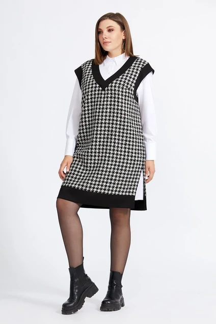 Комплект женский, состаящий из удлиненной блузки и жилета. Блузка свободного силуэта. Воротник рубашечного типа. Рукав втачной, на широкой манжете. По переду-застёжка на петли-пуговицы по всей длине. Жилет свободного силуэта.V-образный вырез горловины. По горловине, пройме и низу-отделка из трикотажа. По бокам разрезы.