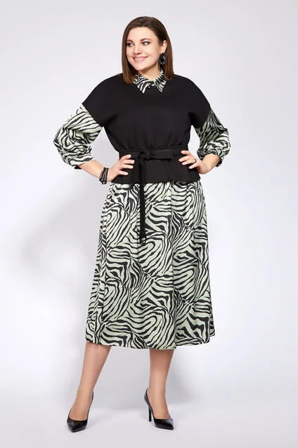 Комплект женский, состоящий из платья и жилета. Платье свободного силуэта. Горловина рубашечного типа. Рукав втачной-7/8, на манжете. Застёжка по переду до талии на петли-пуговицы. Жилет свободного силуэта, на резинке по талии, со спущенным рукавом. В комплекте-ремень.Длина по спинке платья-122см, длина рукава-52см. Длина жилета-52,5см