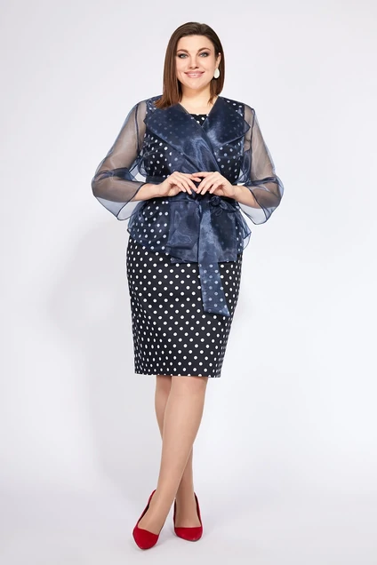 Длина по спинке накидки-59см, длина рукава-49см. Длина по спинке платья-99см. Комплект женский состоящий из платья и накидки. Накидка свободного силуэта, без застёжки. Рукав длиной 7/8. Завязывается на пояс. Платье приталенного силуэта, без рукава, отрезное по линии талии. В среднем шве спинки-застёжка на тесьму-молнию и разрез. состав платья: вискоза 60%, полиэстер 35%, спандекс 5%