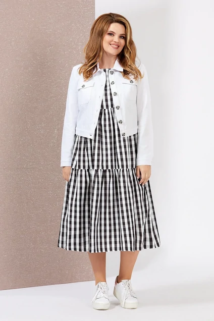 Стильный комплект, состоящий из джинсовой куртки и платья в стиле бохо. Куртка выполнена из эластичной джинсовой ткани. Куртка с центральной застежкой на петли и пуговицы, со стояче-отложным воротником, кокетками по переду и спинке, рельефами и настроченными карманами с клапанами. Все швы отстрочены двойной декоративной строчкой. Куртка с втачным, длинным рукавом с притачной манжетой, которая застегивается на петлю и пуговицу. Платье с втачным коротким рукавом, к низу которого притачено кружево. Чуть выше линии талии и выше колена подрезы со вставками из кружева поверх основной ткани. От подрезов легкая сборка. По спинке у горловины застежка на навесную петлю и пуговицу. в 52р. Платье: Ширина груди- 57см, Ширина талии -52см, Длина рукава- 24см, Ширина рукава-19,5см Куртка: Ширина груди- 56см, Ширина талии -54см, Длина рукава- 59см, Ширина рукава-19см Длина платье115 куртка 48 Платье: Вискоза 55%, ПЭ 35%, Хлопок 10%.