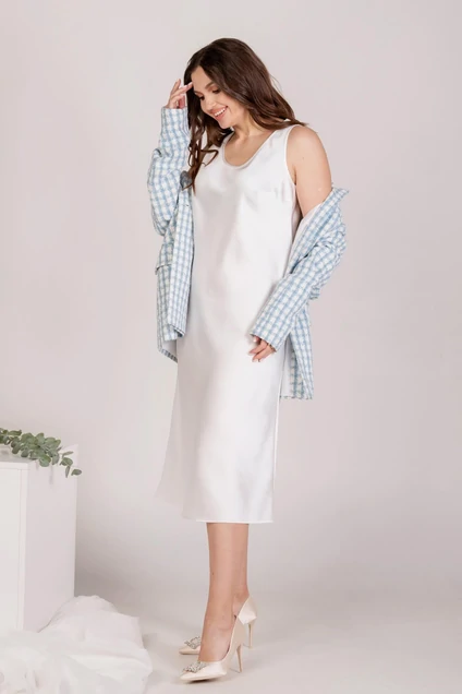 Платье женское бельевого стиля прямого силуэта без рукавов, выполнено из атласной ткани. По переду нагрудные вытачки. Плате без подкладки.